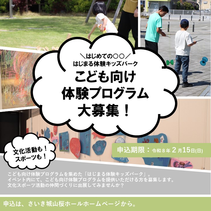 こどもたちが「はじめて」の体験を通じて、新しい活動をはじめる第一歩、引いては仲間づくりにつなげるため、こども向け体験プログラムを集めた「はじまる体験キッズパーク」を開催します。本募集は、こども向け体験プログラムの提供者を募集するものです。