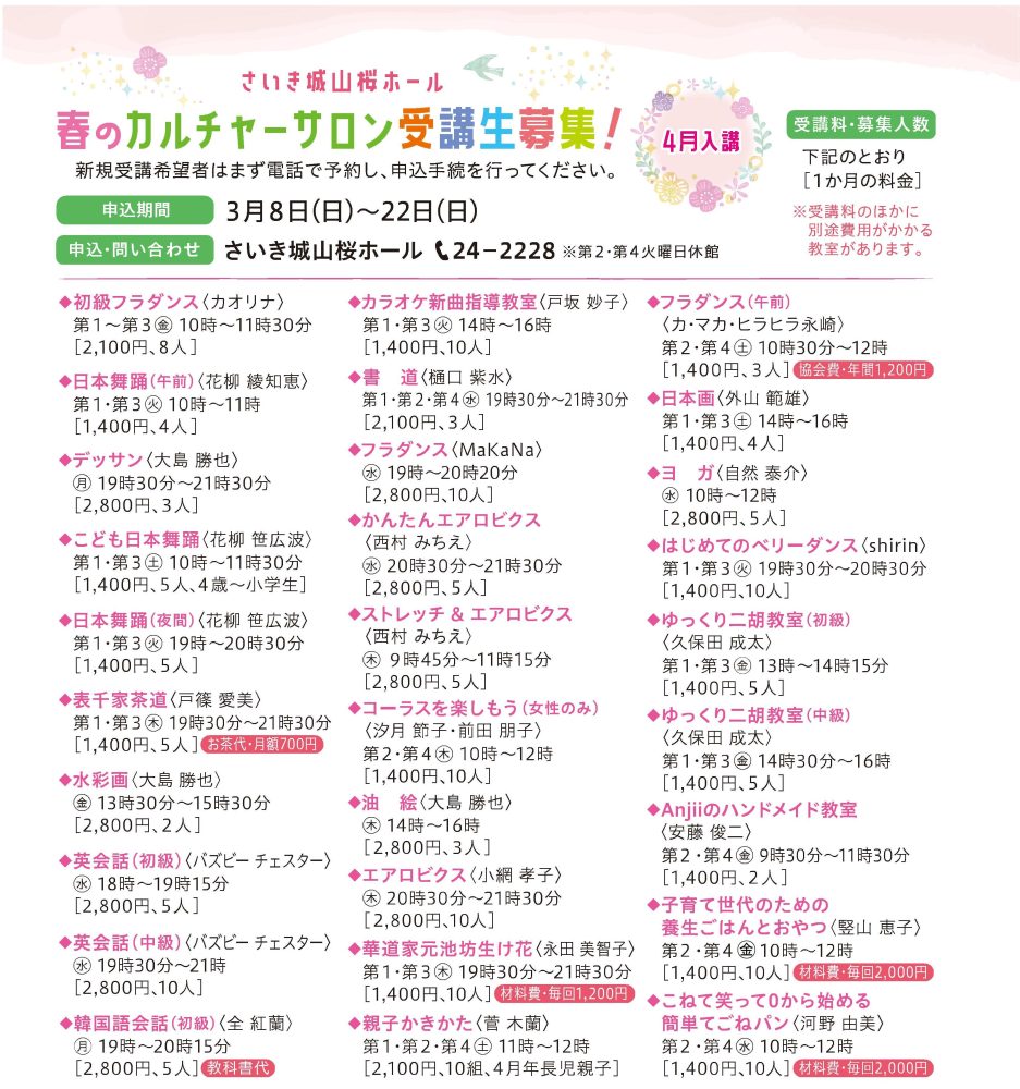 ―お詫びと訂正―市報さいき3月号 14ページ「春のカルチャーサロン受講生募集!」の記事に誤りがありました。◆子育て世代のための養生ごはんとおやつ(〇正)第2・第4㊎(×誤)第2・第4㊌